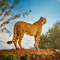 a rocky outcrop. The cheetah is looking directly at the camera, appearing alert and focused. The background showcases a sky with clouds that are illuminated by sunlight, which creates