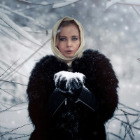 a young girl in the midst of a snowy landscape. She appears to be bundled up against the cold, with her hands placed close together and possibly holding something, perhaps food or