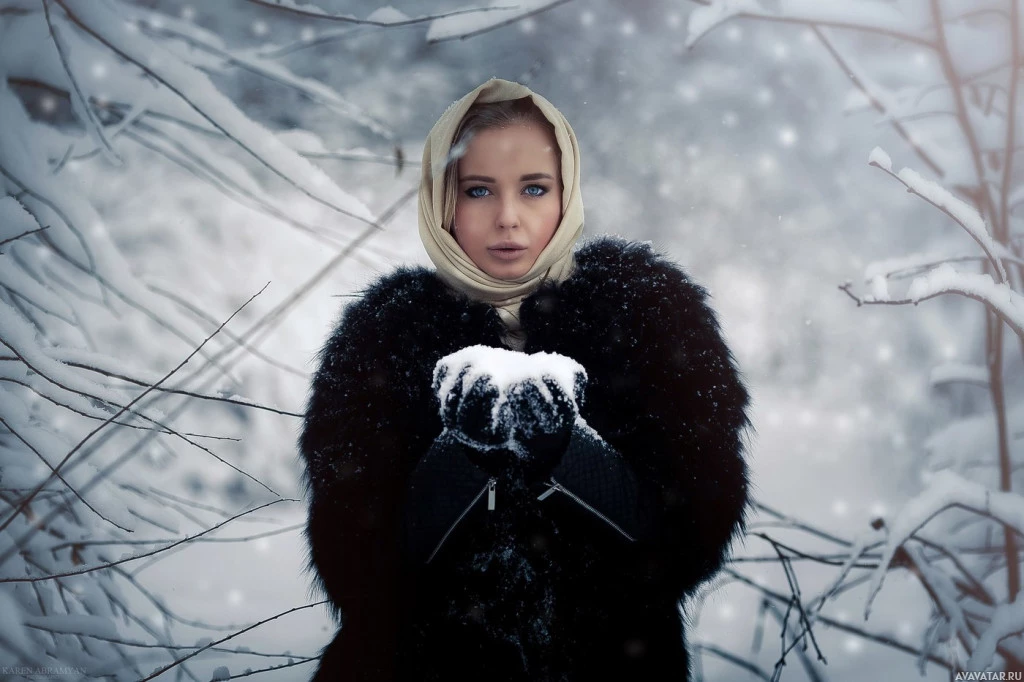snow on the ground and the trees around her indicate that it is likely late autumn or winter. The mood of the picture seems quiet and introspective.