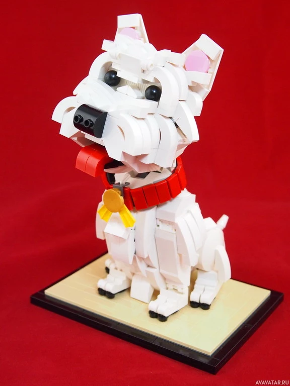 a Lego model of a dog. It is a creative representation of an animal, likely designed with Lego bricks to capture the details and features of a real dog, such as its fur texture,