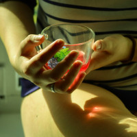 The image shows a person sitting down, holding what appears to be a cup with their hands. The person is wearing a top that has