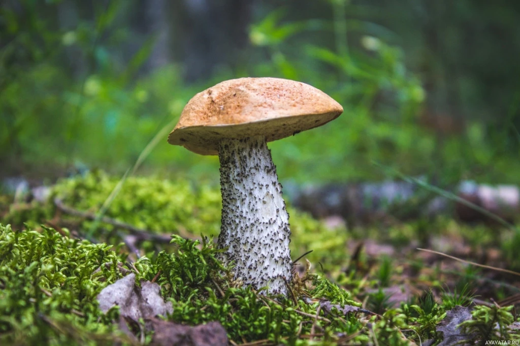 The picture shows a mushroom growing in what appears to be a forested or wild area. The ground is covered with a carpet of moss, and there are