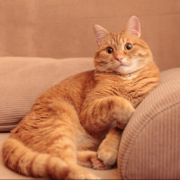 tabby cat sitting on a couch. It appears to be looking directly at the camera with a somewhat surprised or alert expression, which could be interpreted as a "
