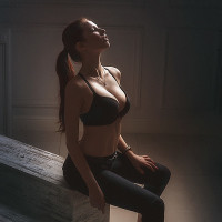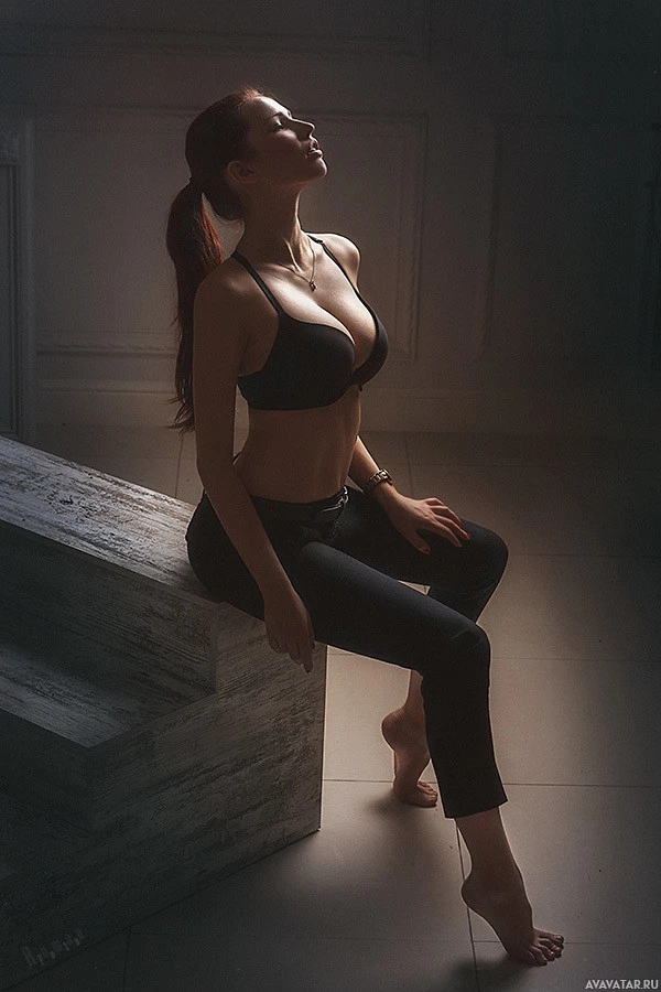 a black bra and pants, which gives the impression that she might be at a photo shoot or a modeling session. Her gaze is directed off-camera, and her