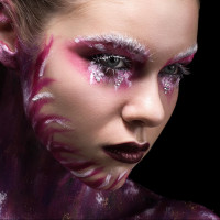makeup application that resembles paint or a temporary tattoo-like design. The individual is looking directly at the camera with