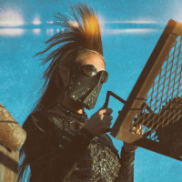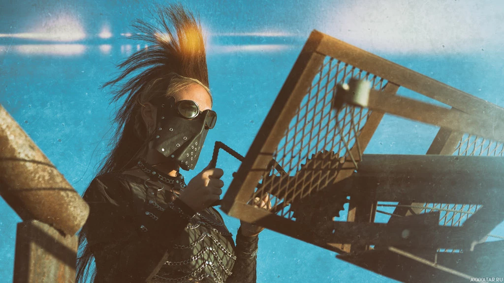 a metal frame, possibly some sort of weapon or tool. The background is not clearly visible due to the mask covering part of the face, but it suggests an industrial or outdoor setting. The overall style of the image gives it an artistic or dramatic feel.
