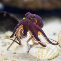 The image features an octopus in a tank. It is characterized by its distinctive purple-brown coloration and the long, trailing tentacles that are typical of these animals. The background appears to be a sandy or gravel bed, which is common for marine species' tanks in aquariums.