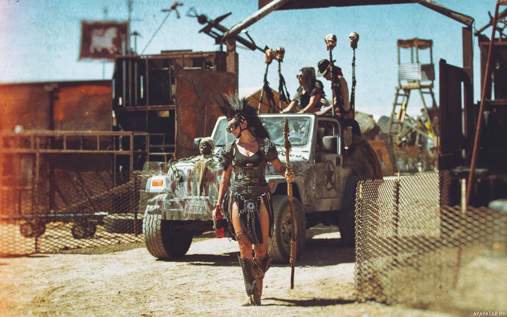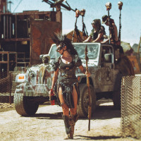 tribal clothing, standing in front of a car that looks somewhat rugged, fitting the post-apocalyptic theme. The background has a barren, desert-like appearance, suggesting