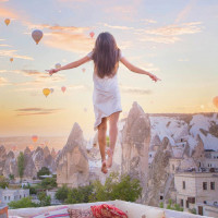 hot air balloons floating above the landscape, which adds a whimsical and romantic atmosphere to the scene. The location appears to be Cappadocia in Turkey, known for its unique