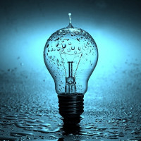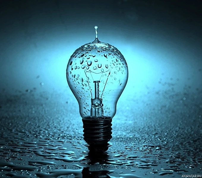 На картинке изображена одна лампочка, плавающая в воде. Фон темный, что подчеркивает лампочку как центральный предмет фотографии. Капли воды на поверхности предполагают, что лампочка была недавно погружена или помещена в воду.
