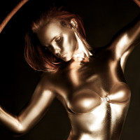 body paint that gives her an almost metallic look, reminiscent of chrome or gold. Her eyes are closed and she has