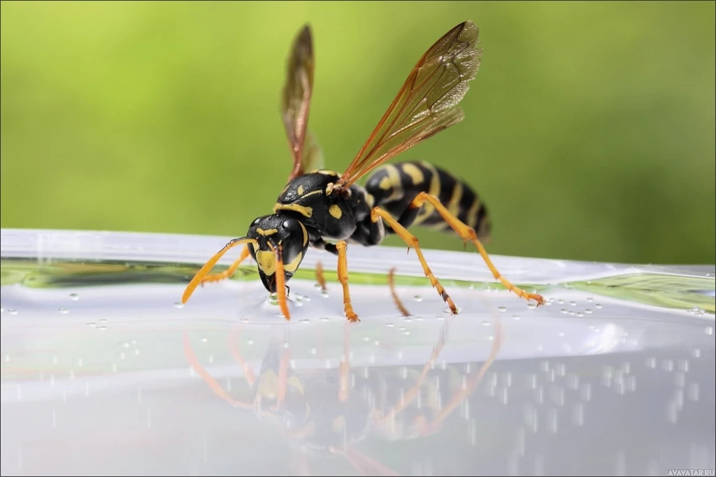 На картинке изображена пчела, конкретно идентифицированная как оса в желтой куртке по ее отличительной окраске. Он либо отдыхает, либо осматривает поверхность, на которой находится.