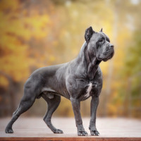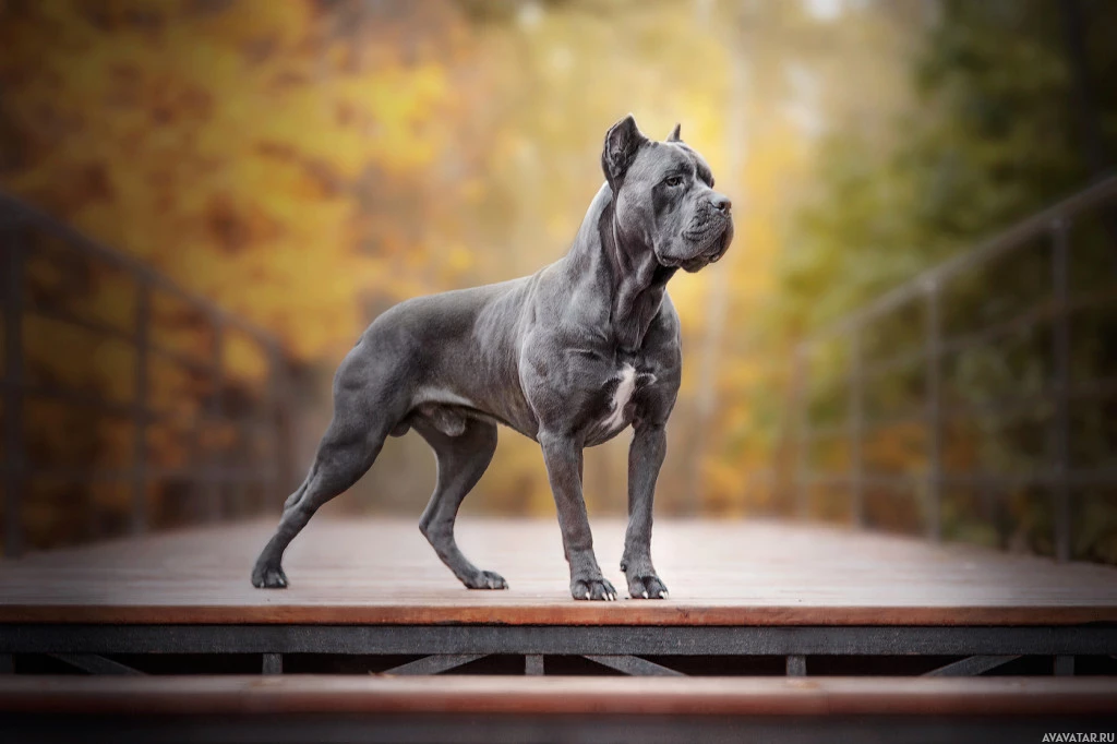 a cloudy day with autumnal colors, suggesting it might be fall. The dog has a solid body and sturdy legs, indicating that it could be a breed known for its strength and athleticism, such as