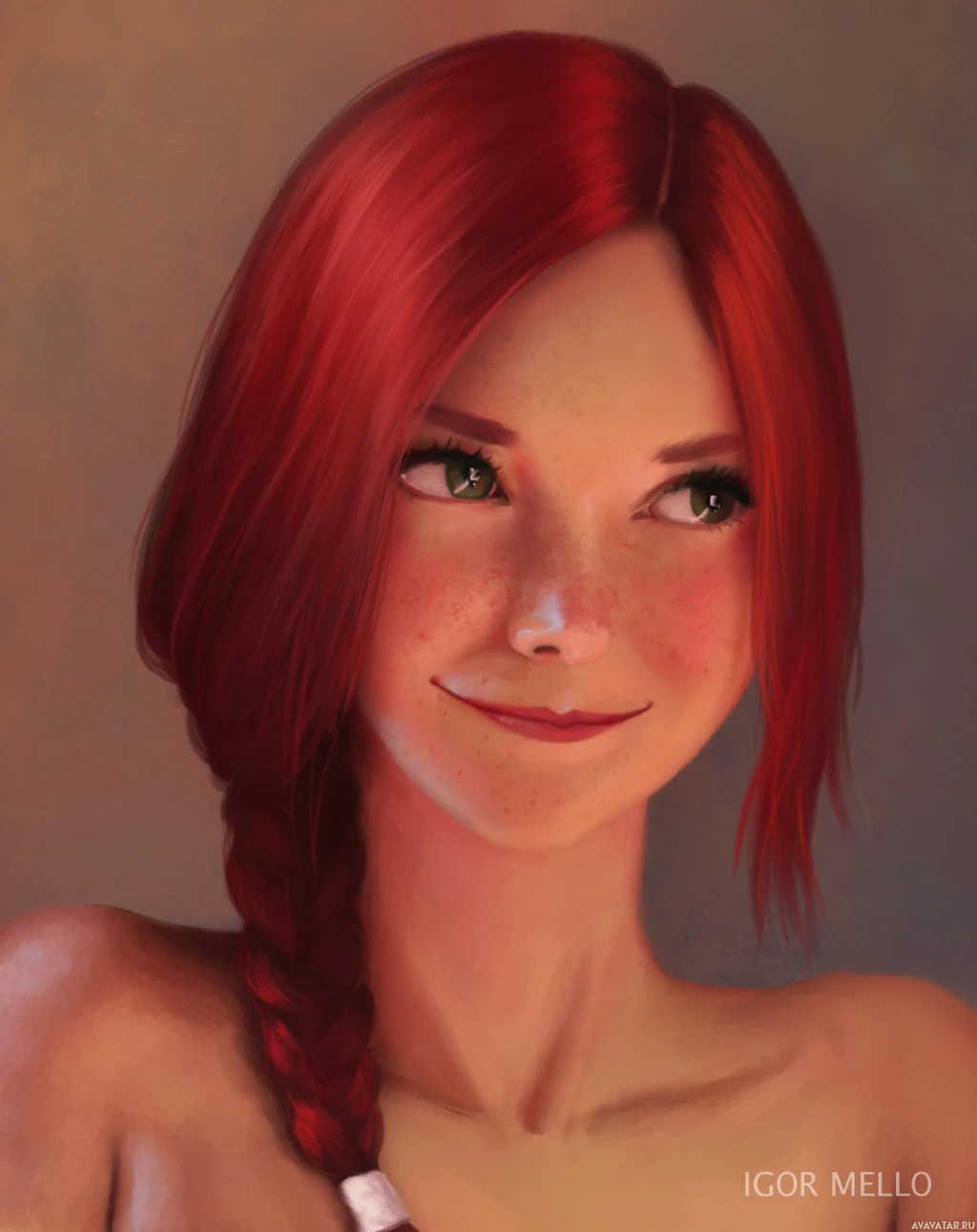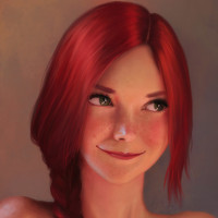 red hair styled in braids, smiling gently at the viewer. She appears to be looking slightly to her right as if something has caught her attention or she's lost in thought. Her features are drawn with a soft and somewhat stylized quality, giving her a youthful appearance. The artwork is detailed and uses