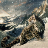 a winter scene with snow covering the ground and the surrounding landscape. There is an animal that resembles