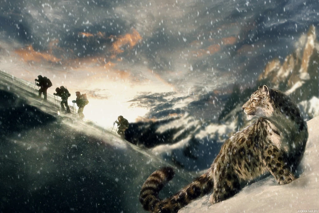 a snow leopard sitting on the left side of the image, facing towards the right. On the right side of the image, there are human figures wearing warm clothing and backpacks, suggesting they might be hikers or climbers in