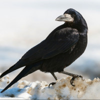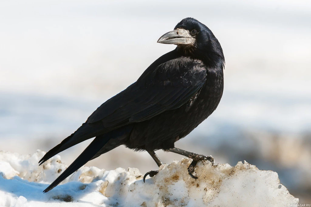 На картине изображена черная ворона, стоящая на заснеженной земле. Птица, кажется, смотрит влево, а фон относительно прост с некоторыми разбросанными пятнами снега.