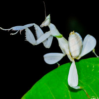 This image features a praying mantis. It is an insect known for its characteristic posture where it holds its front legs together in a "prayer-like" fashion. The mantis appears to be perched on a leaf, which suggests it might be in a natural environment or possibly set up for photography purposes.