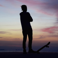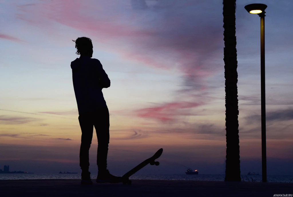На картинке виден силуэт человека, стоящего на пирсе со скейтбордом. Небо окрашено в оттенки заката, переходя от теплого оранжевого к более прохладному голубому на горизонте. Человек кажется расслабленным или задумчивым, глядя в сторону воды с лодками и транспортными контейнерами, видимыми вдалеке, предлагая обстановку гавани.
