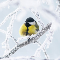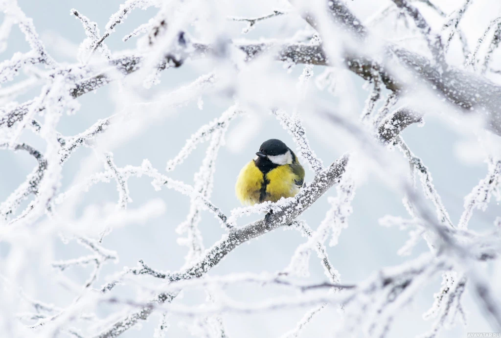 На картинке изображена маленькая птица, вероятно, тип сисек, сидящая на ветвях дерева. Имеет красочное оперение с оттенками желтого и черного, а также белые отметины. Фон заполнен заснеженными деревьями, которые, кажется, находятся в зимней обстановке, что указывает на холодные погодные условия.