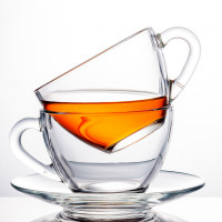 a small plate and there is some light shining onto the surface of the tea, which enhances the visibility of its steamy state. The image suggests that the tea is freshly poured or brewed and ready to be enjoyed.