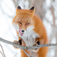 a tree branch, possibly seeking food such as berries or other prey that might have found shelter in the trees.