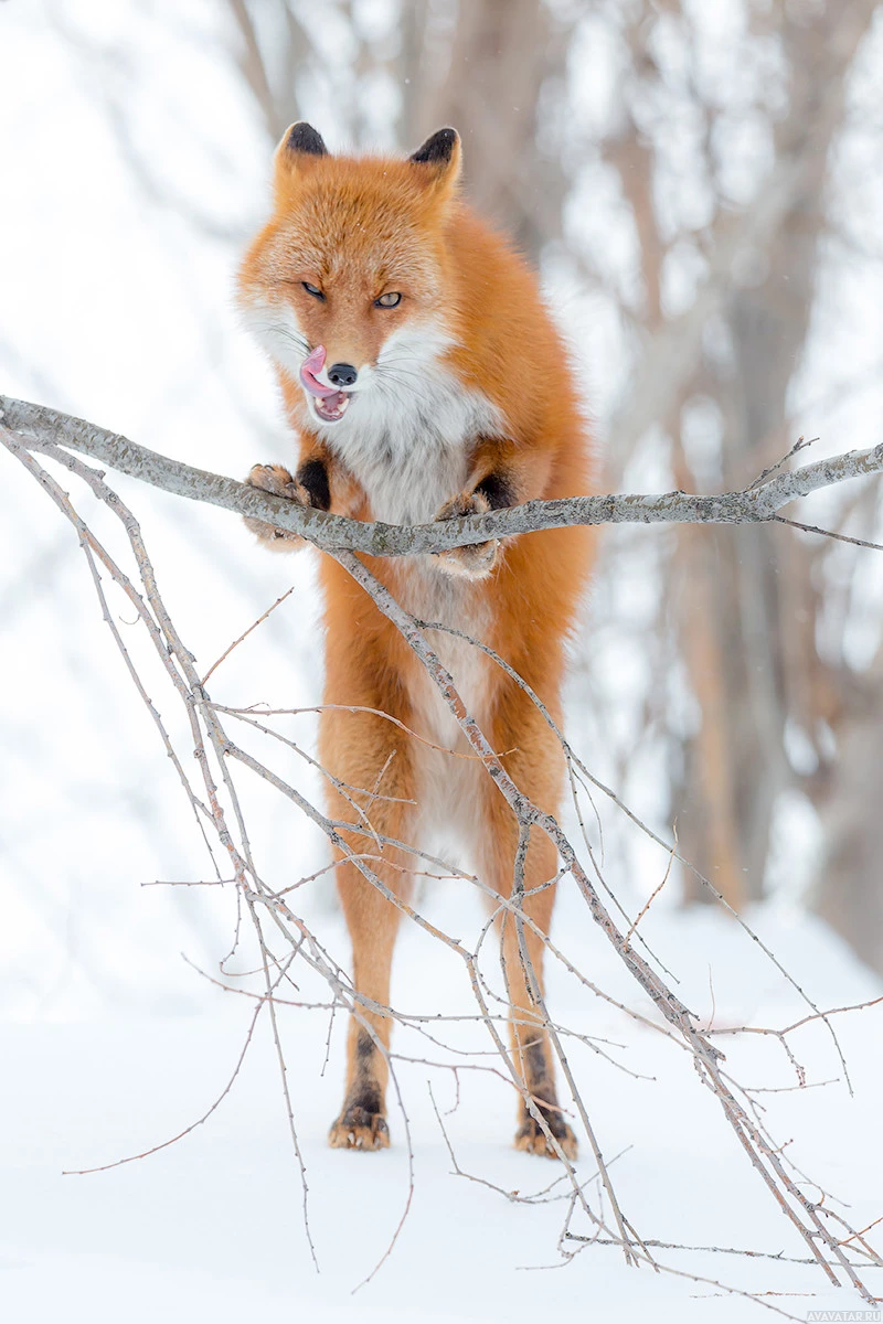 a winter scene with snow on the ground and trees in the background, which suggests it might be during late autumn or winter. The fox appears to be standing on