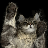 The image shows a cat with its paws raised, as if it's waving or celebrating. It appears to be an indoor setting with a black background that contrasts with the light-colored fur of the cat.