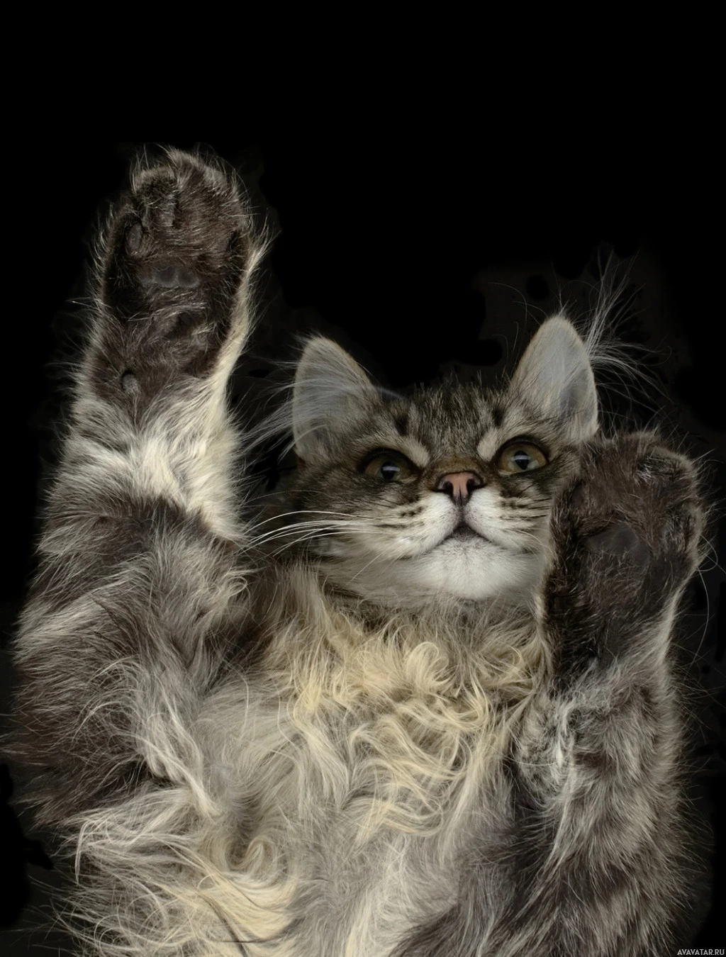 На картинке изображен кот с поднятыми лапами, как будто он машет или празднует. Похоже, что это крытый интерьер с черным фоном, который контрастирует с светлым мехом кошки.