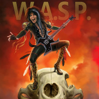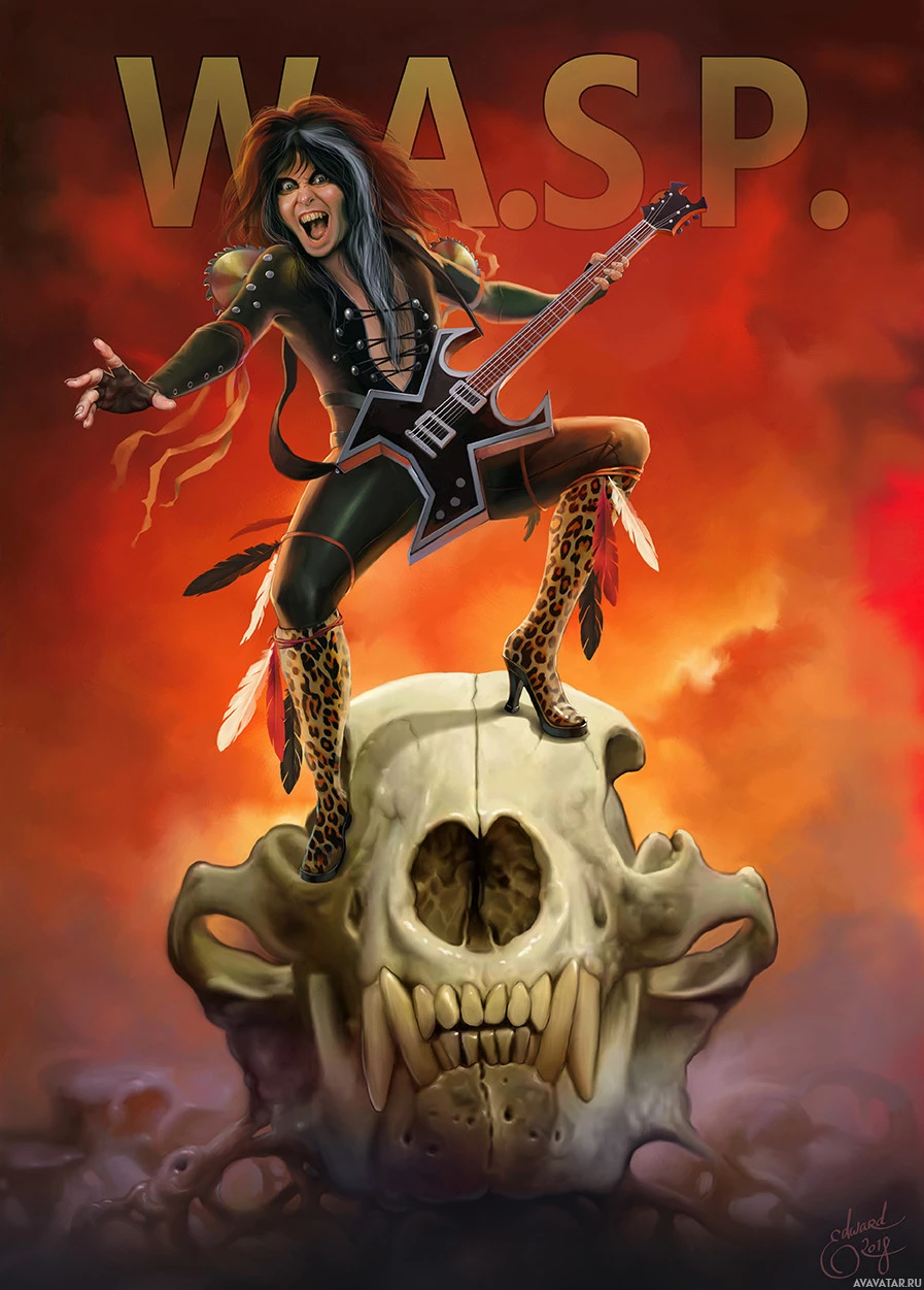 the lead singer of the band W.A.S.P., known for his distinctive black and white attire. The individual is holding an electric guitar with their left hand and appears to be performing or posing dramatically, standing on a skull while emitting