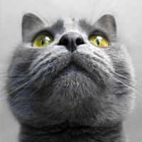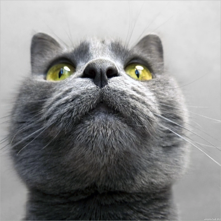 На снимке крупным планом изображена голова серой кошки. Глаза кошки широко открыты, и кажется, что она смотрит вверх или в сторону камеры, прижав нос ко рту, как будто делает какое-то выражение лица или обнюхивает что-то вне кадра.