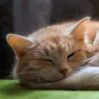 The image shows a cat sleeping comfortably on what appears to be a couch or bed. The cat has short,