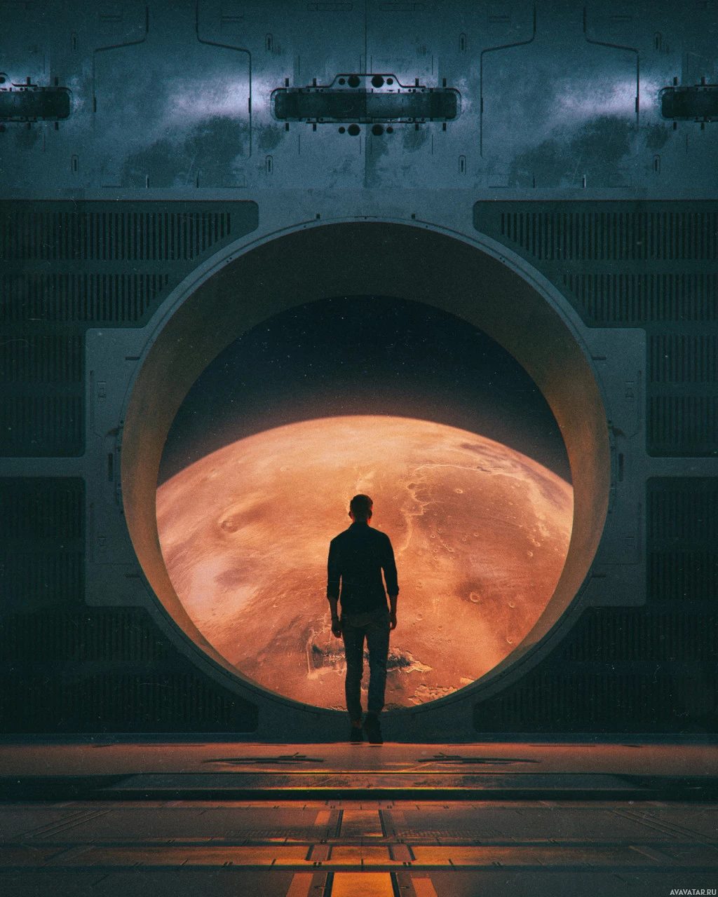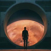 a silhouette of a man standing in front of what appears to be a spacecraft's doorway. Through the doorway, one can see an illustration or graphic representation of another planet, possibly Mars, which is known for its