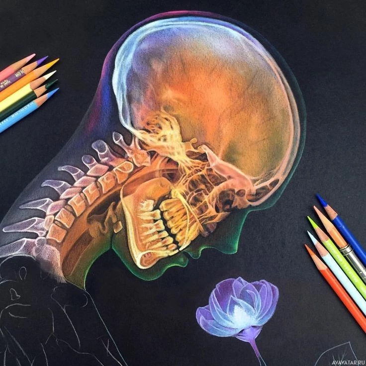blue dot on the chin of the skull's face. The illustration is done with colored pencils, as evidenced by
