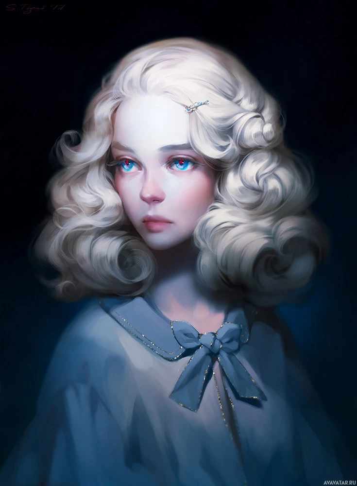 blue eyes and is wearing what appears to be a light-colored outfit with a bow on the collar. The background is dark, which contrasts with her