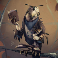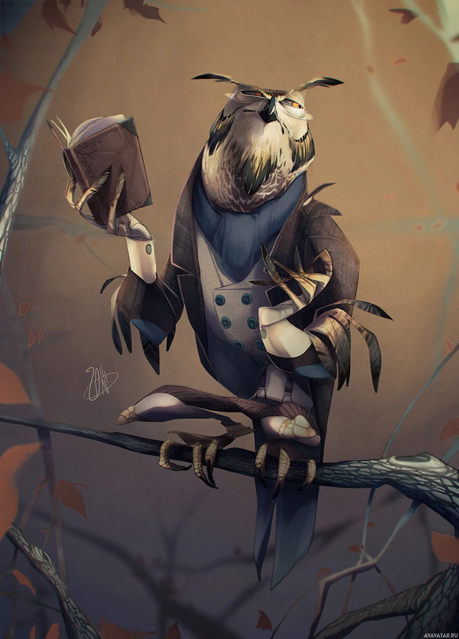 The image depicts an owl perched on a branch. The owl is anthropomorphized, sitting upright and reading a book with its talons. It's wearing what appears to be a cape or robe, which adds a whimsical or fantastical element to the picture. There are