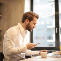 an office environment. He appears to be working on a laptop and also holding a smartphone, possibly texting or using another app. To his left, there's a cup that could contain coffee or tea, which suggests he might be enjoying a drink while working. The setting is modern and professional, with