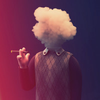 The image features an illustrated character who appears to be vaping. This is indicated by the presence of what looks like a cigarette in the hand, and there's a cloud-like shape where the head should be, which is a common visual representation for smoking or vaping.