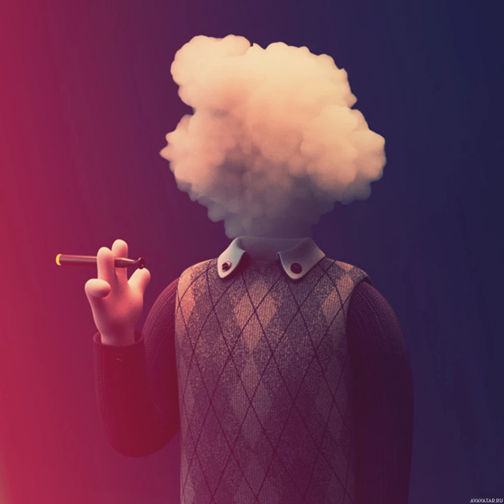 Картинка показывает иллюстрированного персонажа, который, кажется, вейпинг. На это указывает наличие того, что выглядит как сигарета в руке, и есть облачная форма, где должна быть голова, которая является общим визуальным представлением для курения или вейпинга.