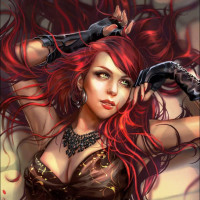 На картинке изображен женский персонаж с длинными рыжими волосами, одетый в наряд, который, кажется, вдохновлен фэнтези или косплеем. Она имеет созерцательное выражение на лице и окружена тем, что выглядит как лепестки цветов, что придает сцене романтическую или мистическую атмосферу.