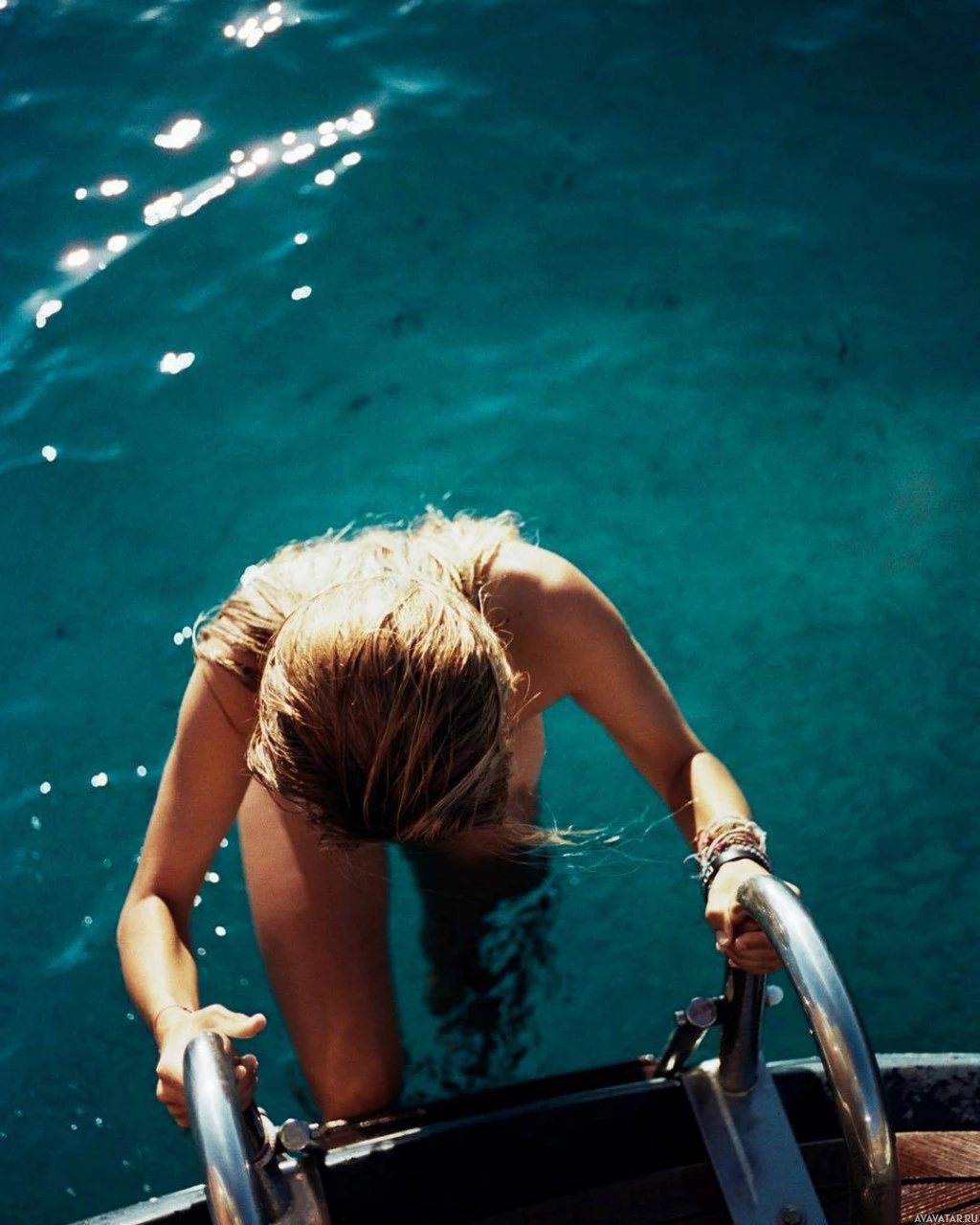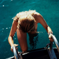 a metal railing, and their head is turned as if they are looking at something off-camera. The individual is wearing swimwear, suggesting that they may have been swimming or are about to go into the water. The setting seems serene with