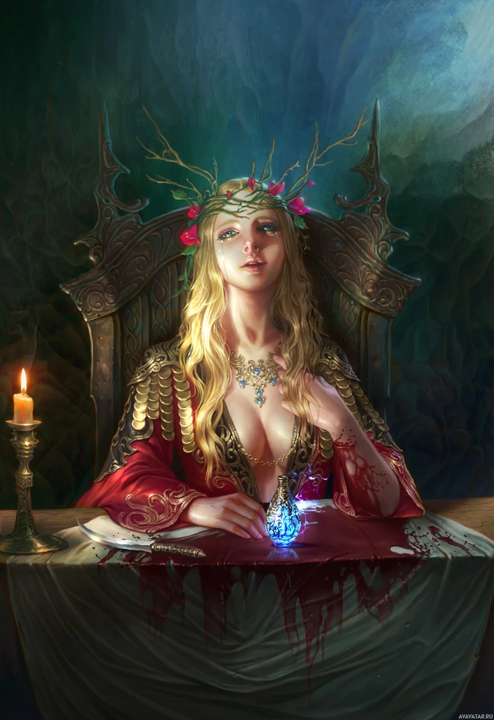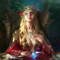 blonde hair and appears to be sitting on a throne with an intricate backdrop that suggests a medieval or fantasy setting. The woman is adorned with