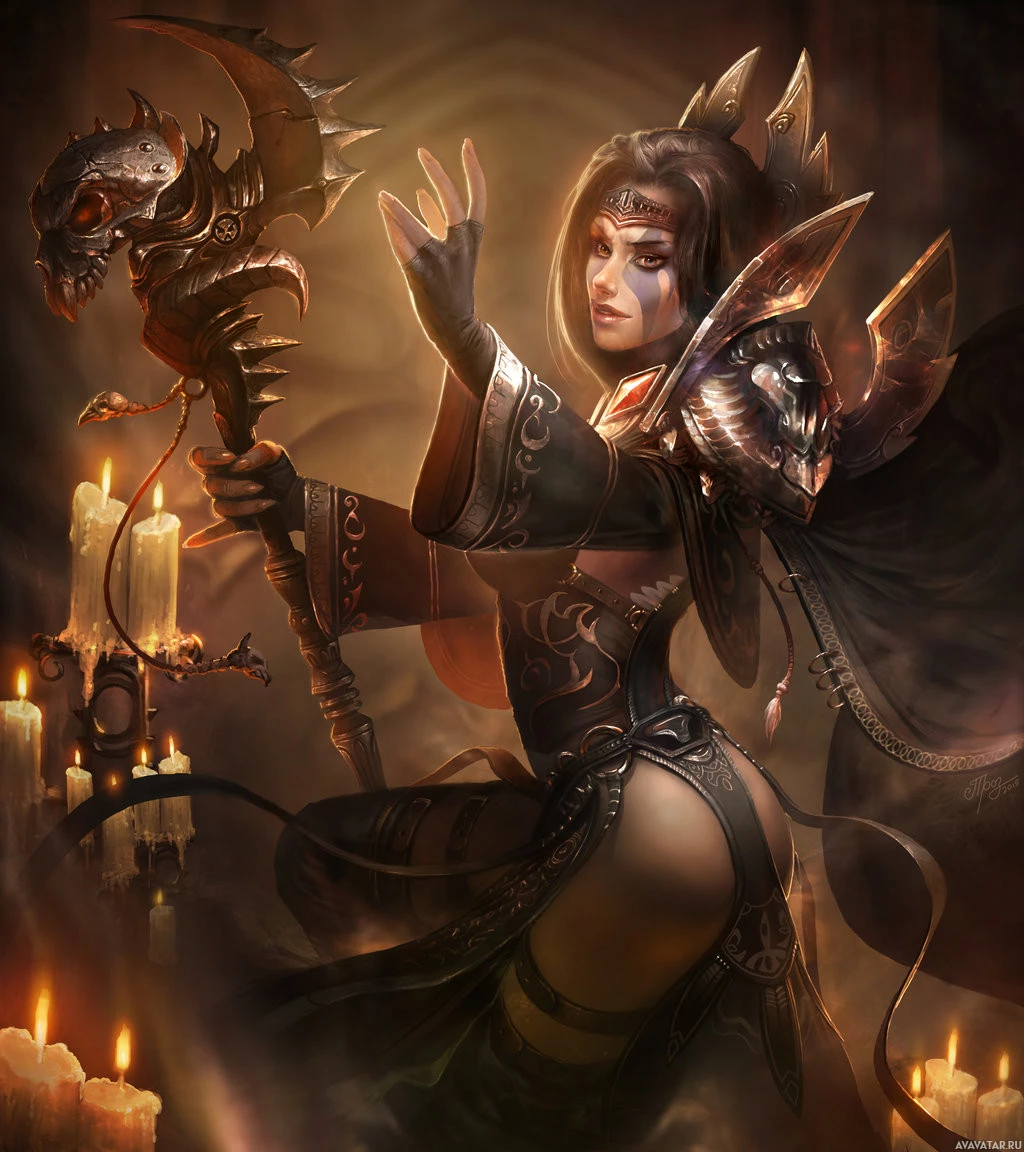 a female warrior or mage. She is holding a staff with what seems to be a skull at the top, and her attire suggests she might be from