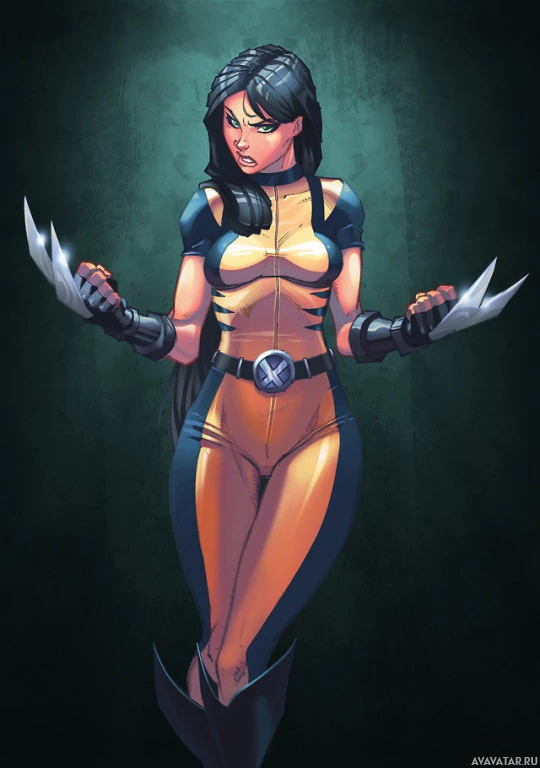 На данной картинке изображен персонаж из комиксов о Людях Икс, известный как X-23. Она изображена в своем культовом костюме, который состоит из желтых и черных элементов, с характерными когтями Росомахи на обеих руках.