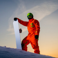 protective gear including an orange and yellow jacket and pants, which suggests they are dressed for safety while participating in winter sports. The person has a snowboard attached to their feet, indicating that they might be preparing to ride or have just finished riding. The background features a beautiful sunset with hues of orange and blue in the sky, suggesting that the photo was taken during the evening or