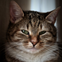 На картинке изображена кошка. Это снимок крупным планом, показывающий кошку с открытыми глазами и глядящую прямо в камеру. Фон размыт, но, похоже, является внутренней обстановкой.