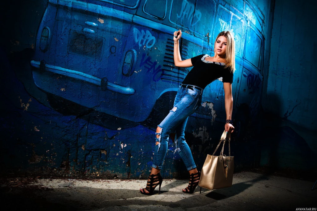 На картинке изображена женщина, позирующая перед стеной с граффити. Она одета в повседневную одежду, в том числе джинсы и высокие каблуки, и, кажется, смотрит на что-то за кадром справа. Рядом с ней лежит сумочка. Стиль фотографии предполагает, что она может быть использована для модных или рекламных целей.
