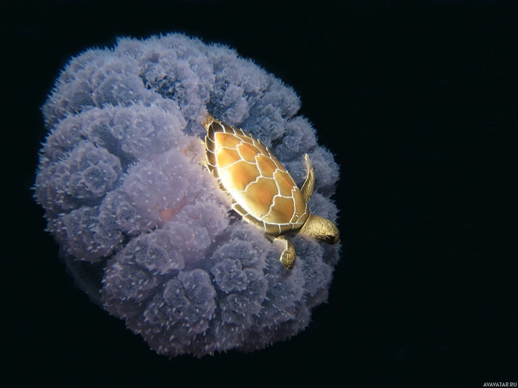 marine life. The turtle's golden shell contrasts with the surrounding purple and white coral, making it