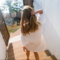 a body of water. They appear to be in a coastal or seaside setting, possibly a white-walled house that could be part of a resort or