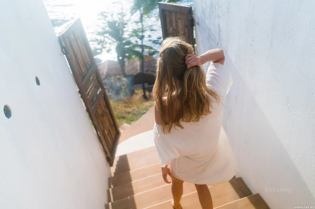 The image features a person standing at the top of stairs, looking down towards